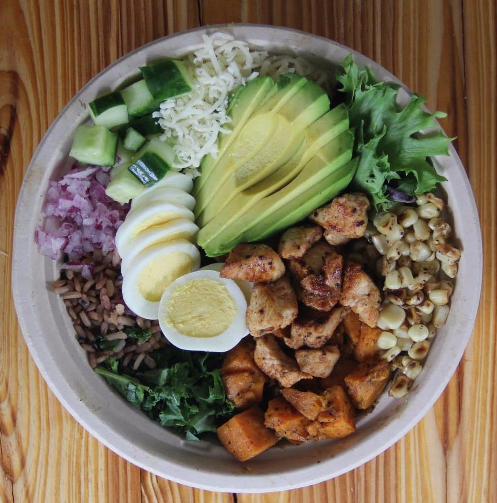 Ingredients: Roasted Sweet Potatoes, Charred Corn, Red Onions, Cucumbers, Avocado, Hard Boiled Egg