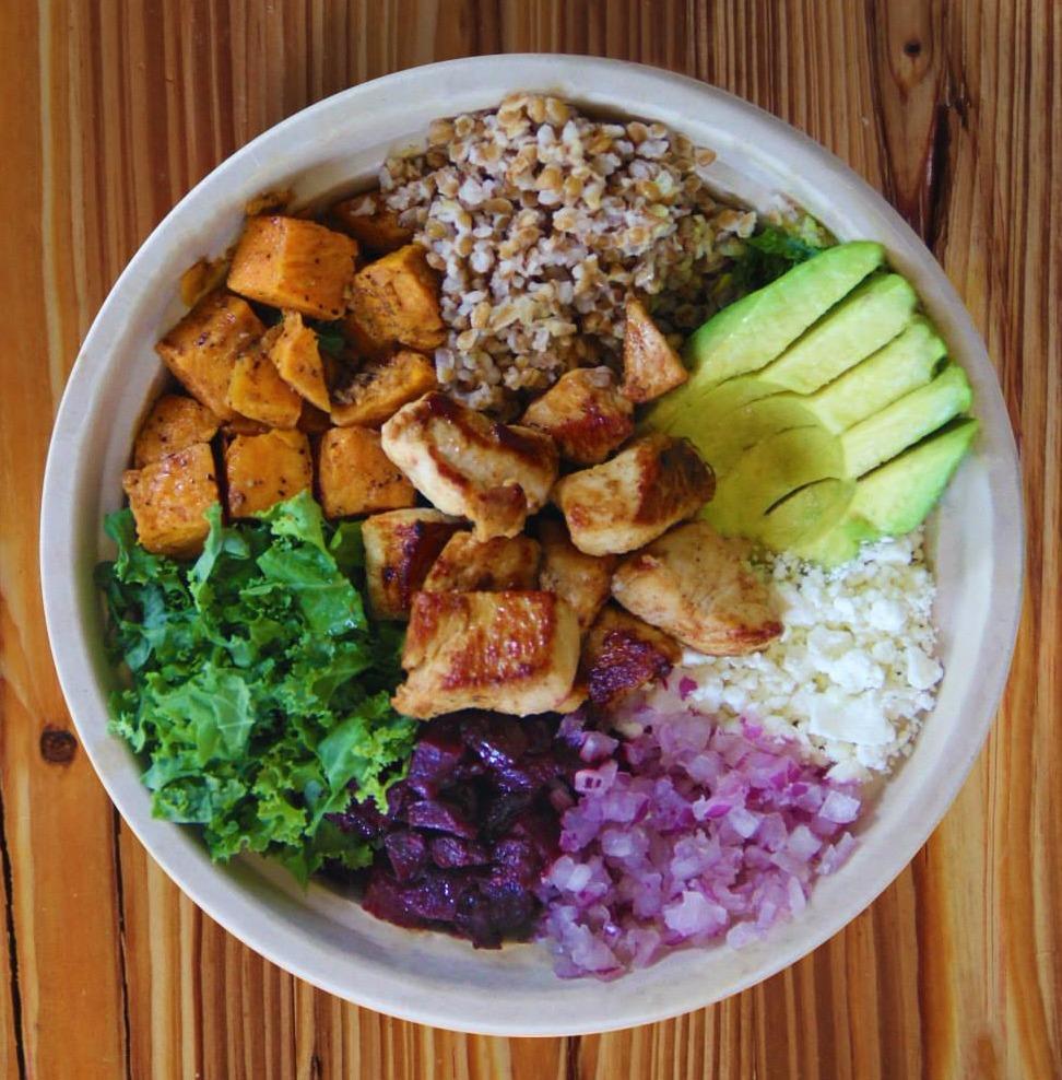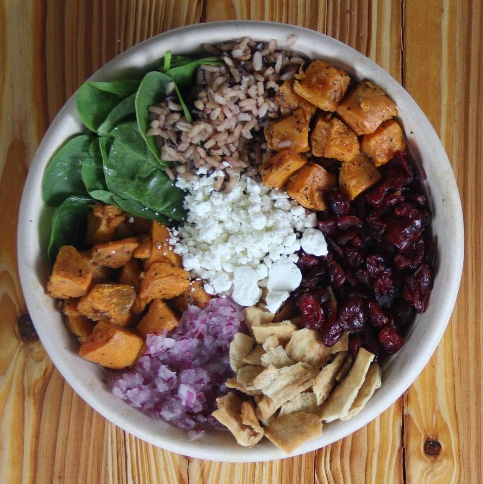 Ingredients: Roasted Sweet Potatoes, Roasted Beets, Red Onions, Goat Cheese, Avocado